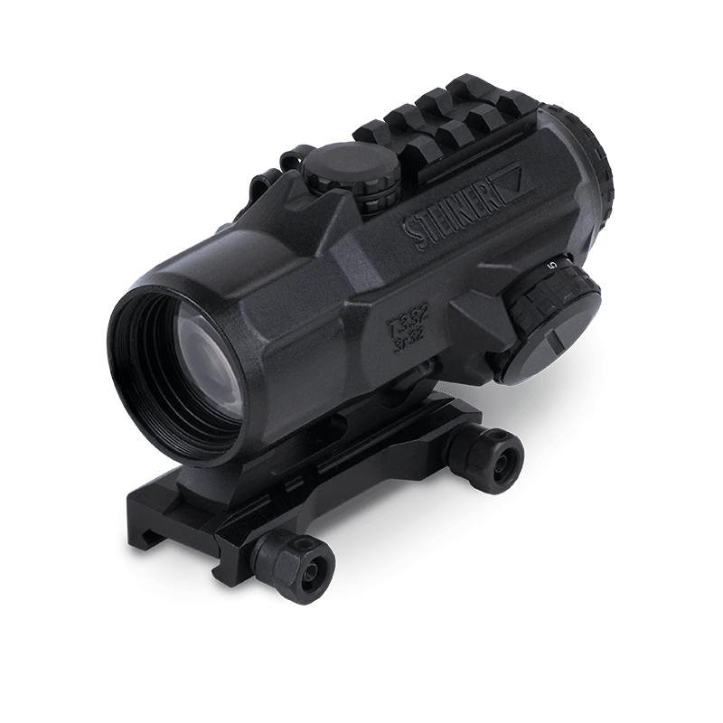 Steiner T332 Zielfernrohr mit Kaliber 5,56 für AR-Plattformen mit drei Vergrößerungsmodellen 3x, 4x und 5x, um ein Ziel von bis zu 600 m zu erreichen. Dieses Modell hat eine 5-fache Vergrößerung. Es ist robust, zuverlässig, langlebig, schlagfest und wasserdicht bis zu einer Tiefe von 10 ms mit einem Einstellbereich von +/- 50 MOA für hohe und seitliche Beleuchtung.