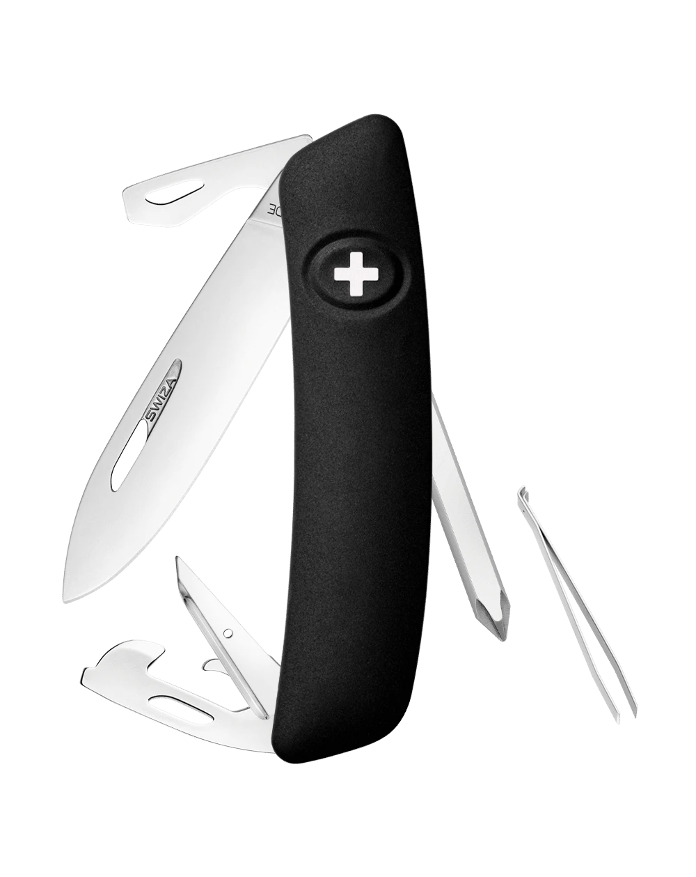 Das Schweizer Taschenmesser Swiza D04 in Schwarz ist ein multifunktionales Werkzeug mit einem Polymergriff aus Gummitextur. Der Griff besteht aus hartem Edelstahl 440. Geeignet für den täglichen Gebrauch.