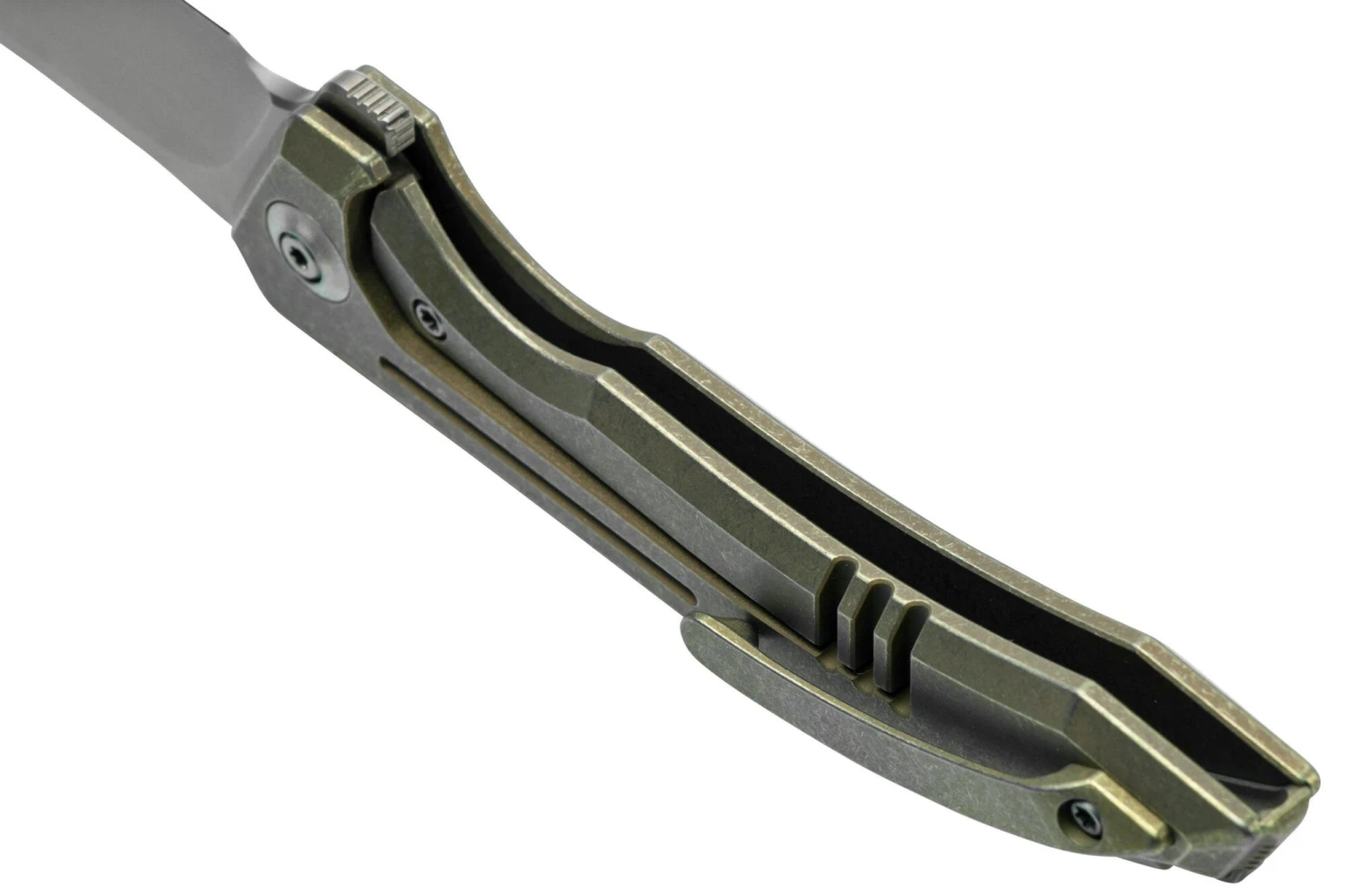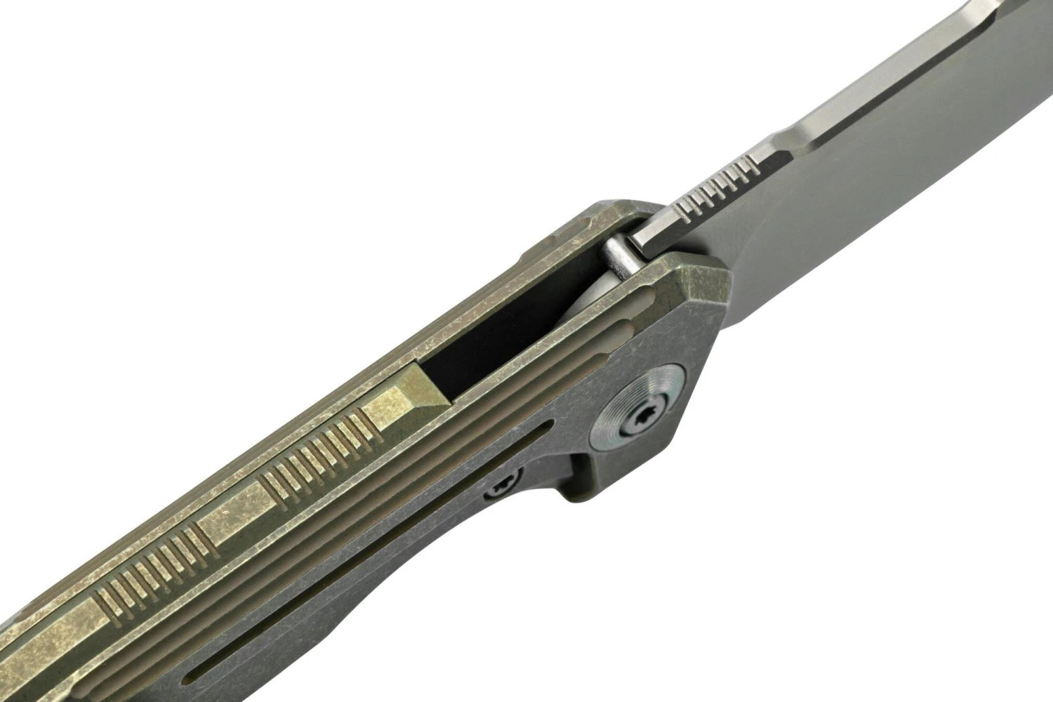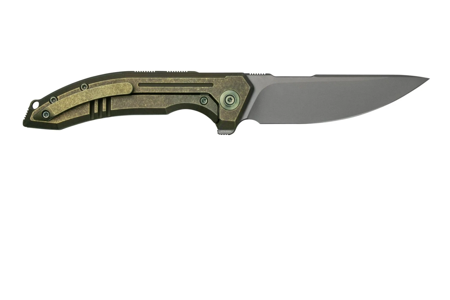 Die Klinge aus hochwertigem CPM 20CV-Stahl lässt sich mit einem Flipper öffnen und wird durch einen Framelock-Verschluss in der offenen Position gehalten. Der schlanke Griff ist aus maschinell bearbeitetem Titan gefertigt. Das Messer ist mit einem Clip für den Transport in der Tasche ausgestattet.
